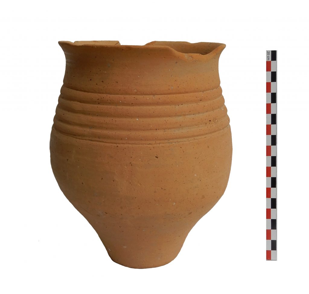 Wheel-shaped pot with decoration of grooves.