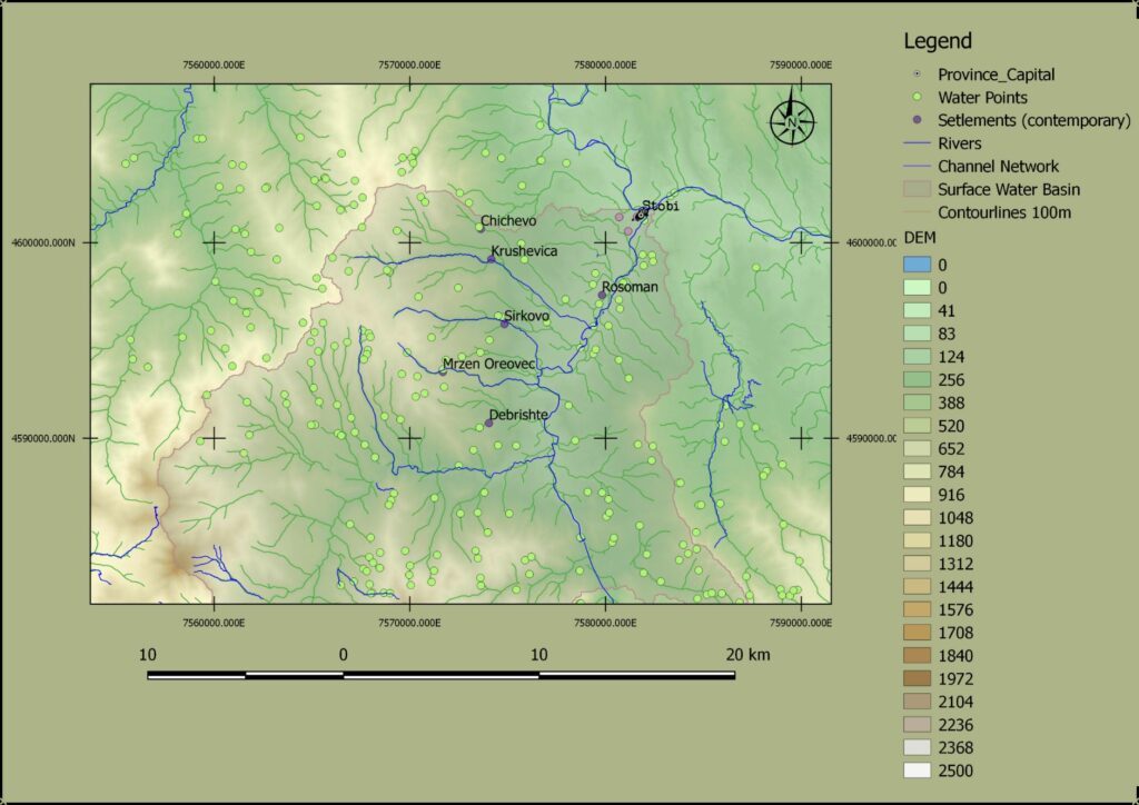 Hydrological analysis of the surface water runoff basin in the southwestern vicinity of Stobi (presented at Land Experience in Antiquity. Build. Redefine. Live University of Rome - Tor Vergara, Faculty of Literature and Philosophy. ROME, 15 - 17 May 2019) (image: Dr. Hristijan Talevski).