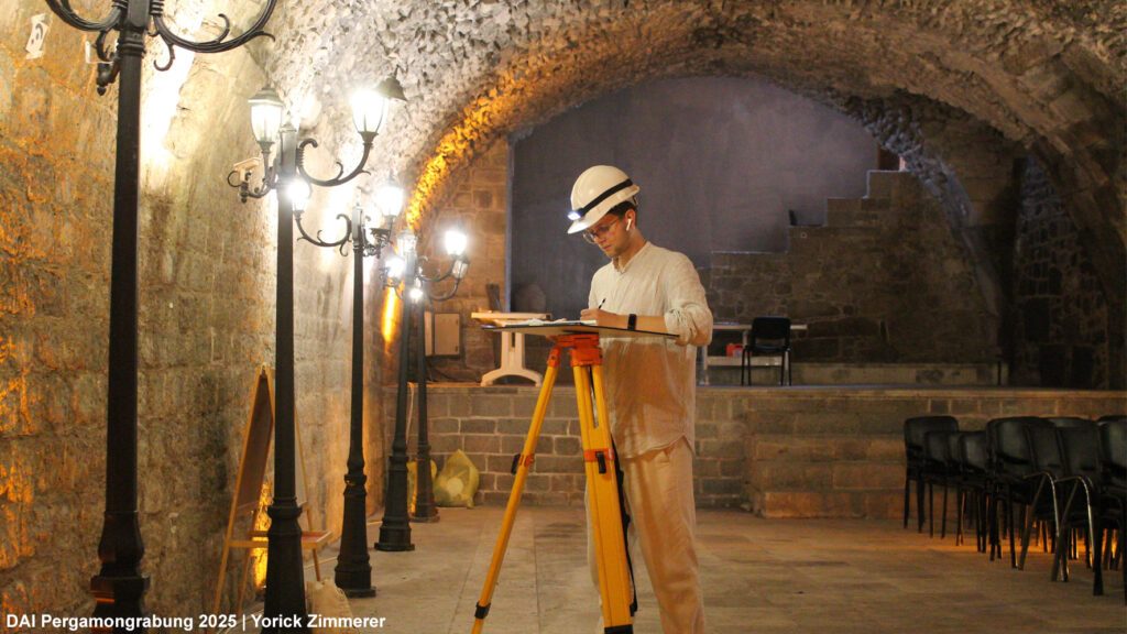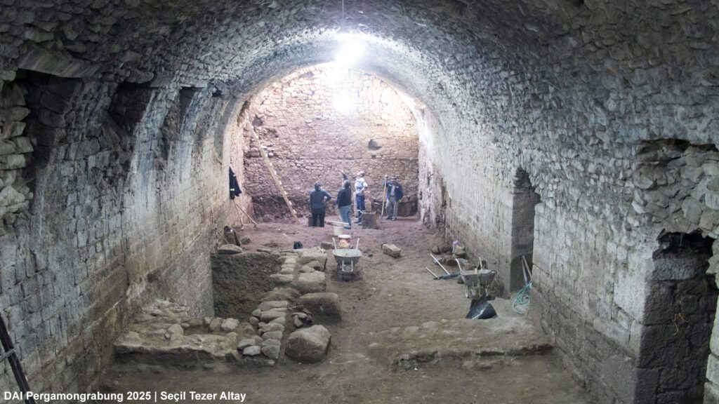 The substructures of the ‘Gurnellia’ consist of elongated chambers, some of which are partially preserved with remnants of their vaults. According to Corinna Brückener (Brückener 2018, 9), they measure approximately 63 x 140 m and follow a roughly north-south orientation (see the Archaeological Map of Pergamon). The southern vault – located below the Akropol Restaurant – survives only in western fragments, while an additional vault defines the western edge of the terrace. This latter structure was further excavated by the Bergama Museum in 2025 (Fig. 2).